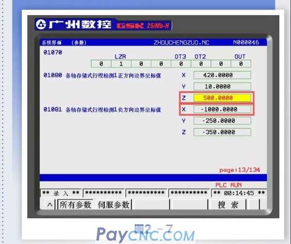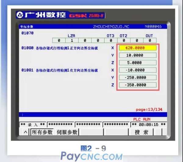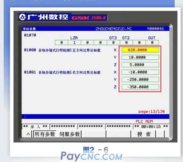 Step 8: Press the system key to enter the system parameter interface, search for parameters No. 1080 and 1081 and input the original parameter data of No. 1080 and No. 1081 recorded in the sixth step, and restore the X and Z axis software limit parameters of the machine tool. As shown in Figure 2-9. ![]()